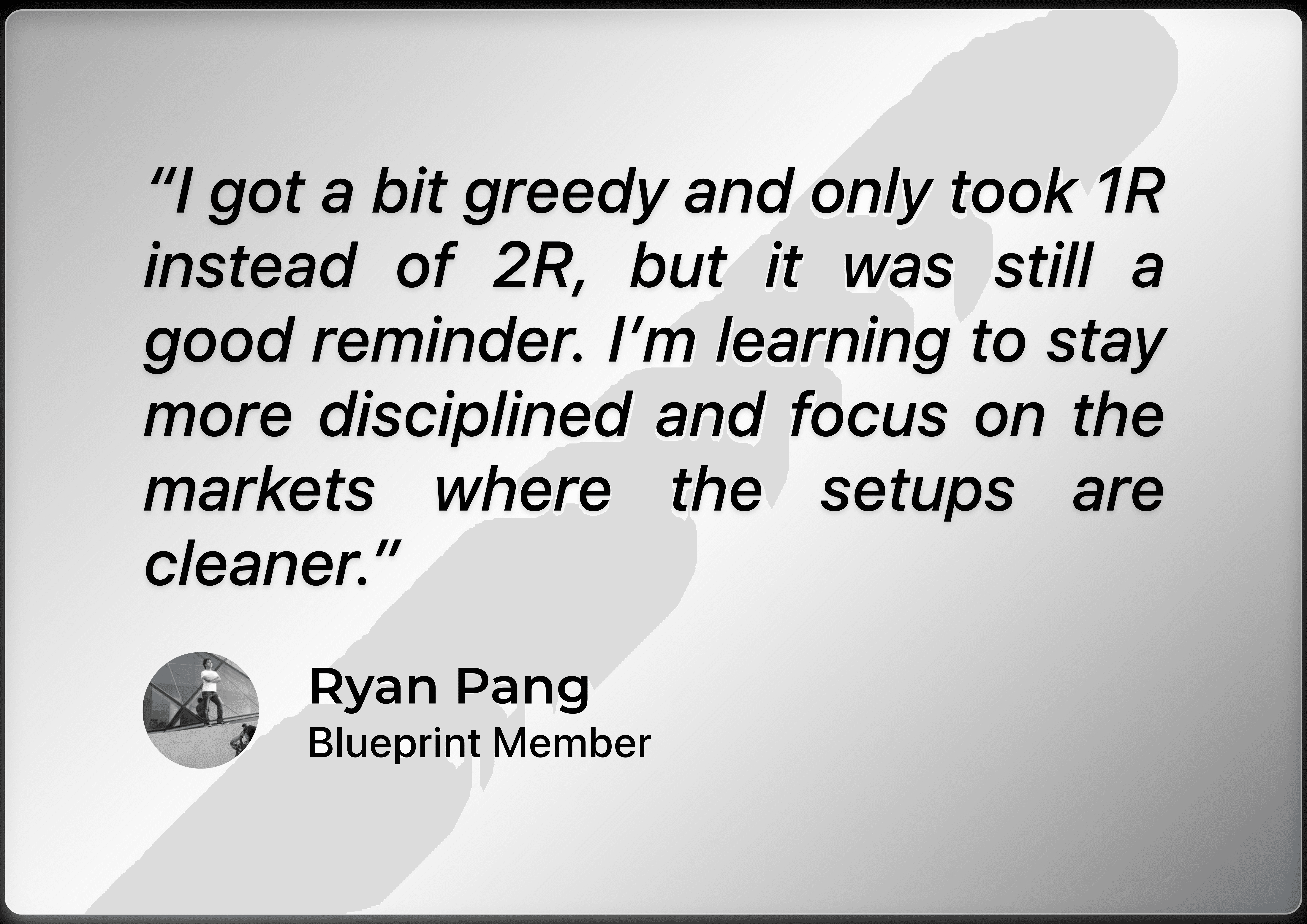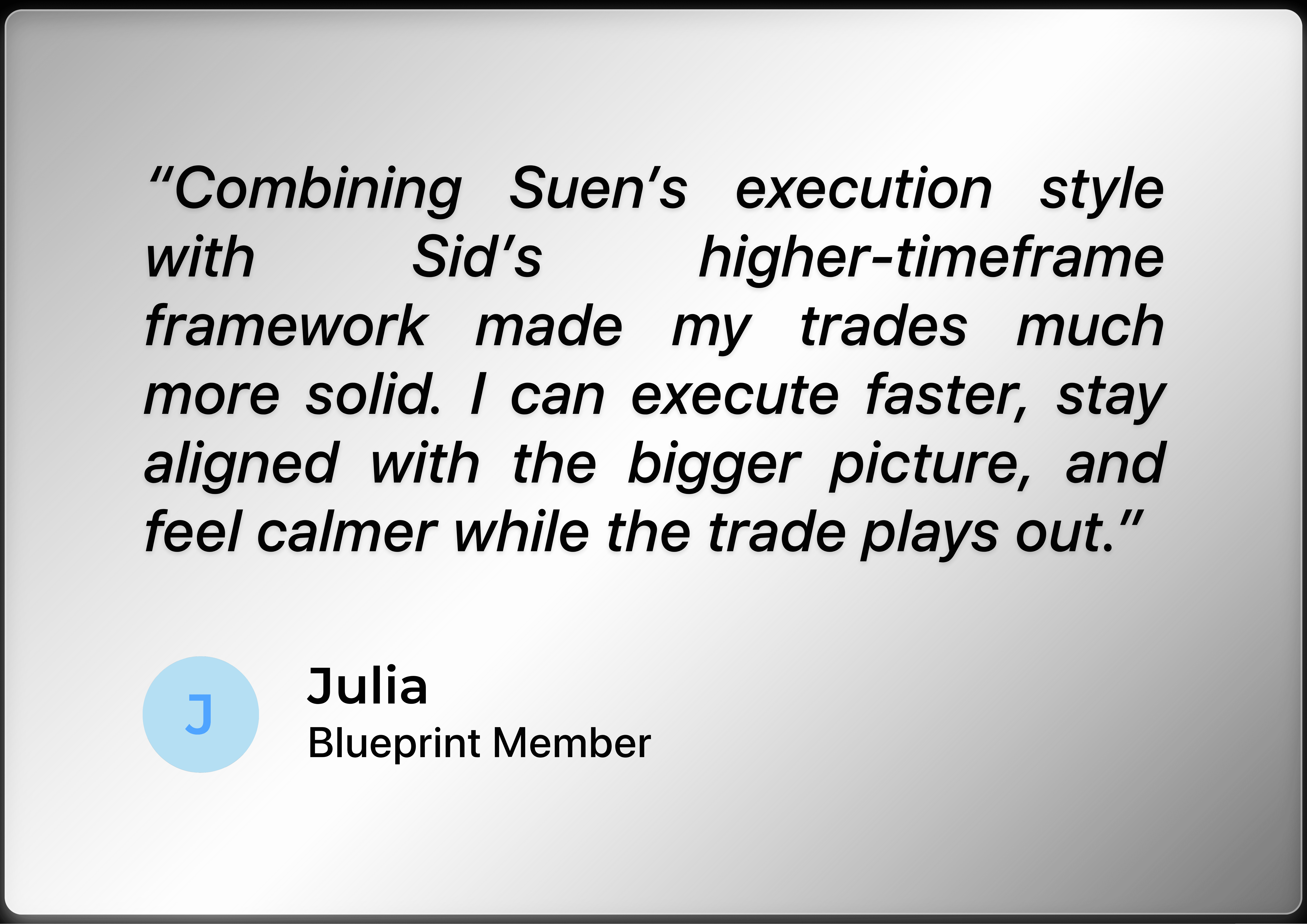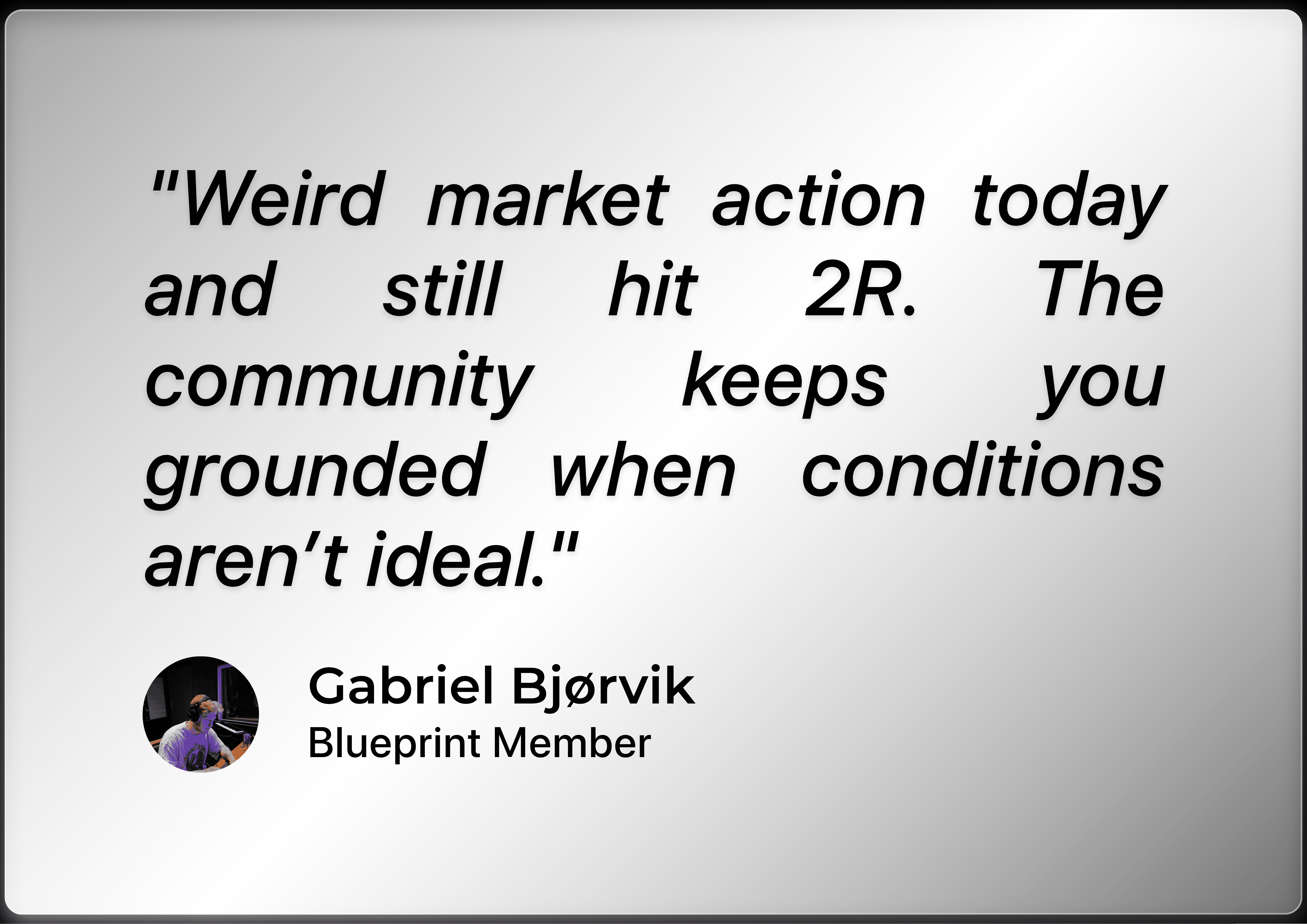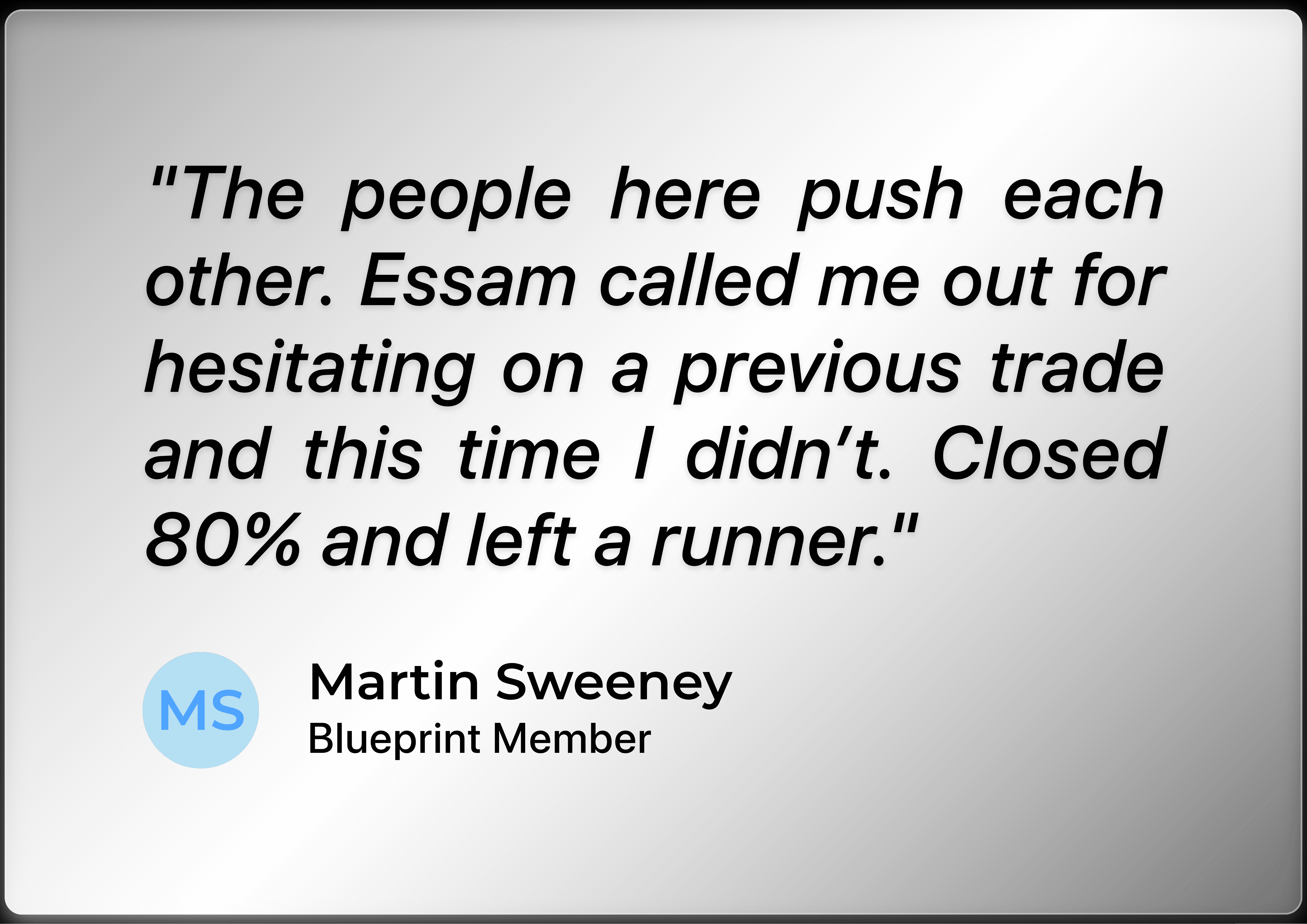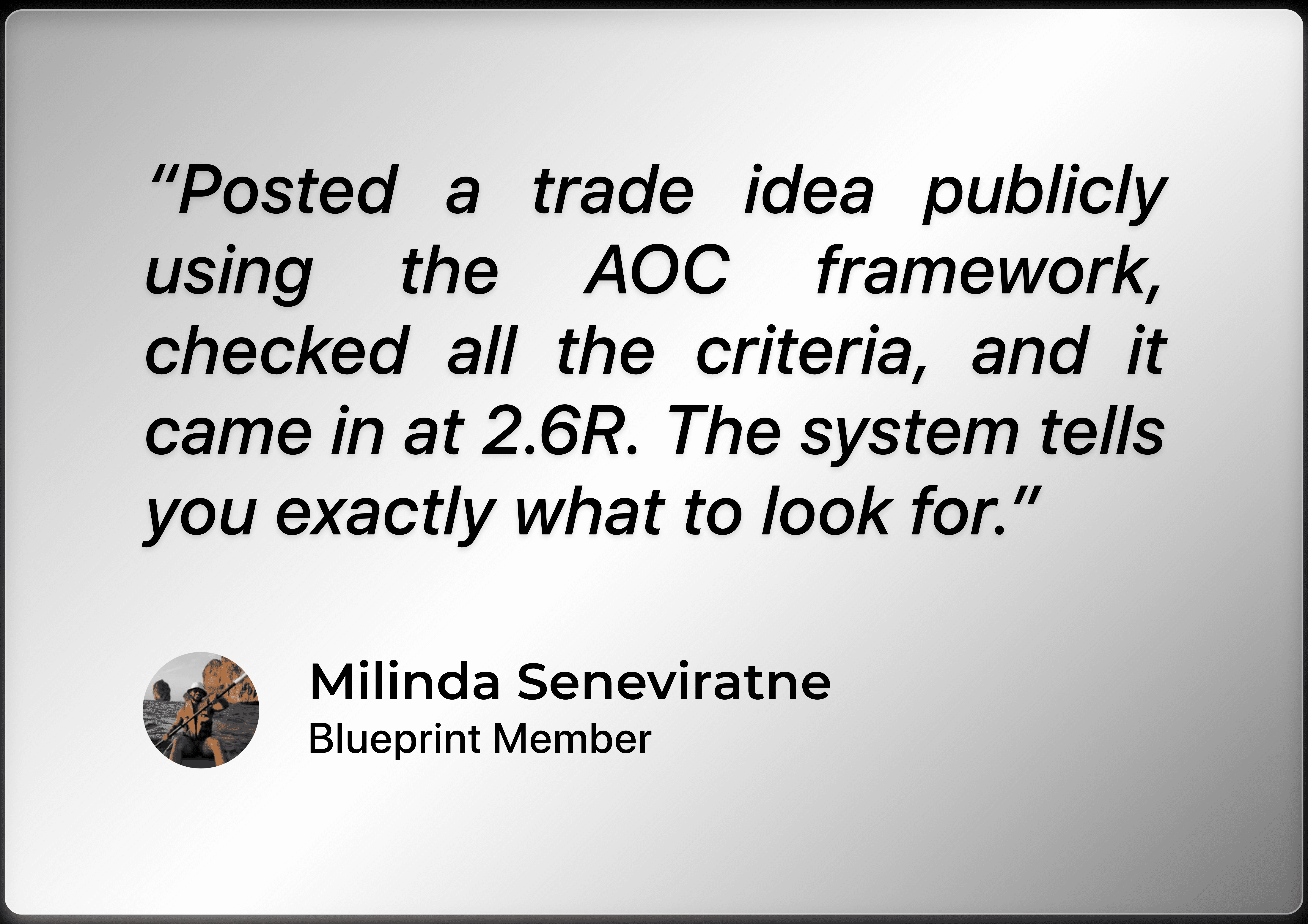 The Blueprint is the complete three-timeframe trading system I've used for 300 days of publicly tracked trade calls. It includes the exact framework, charting templates, risk grading criteria, and execution protocols that produced an 80% win rate, broken down step by step so you can replicate it.